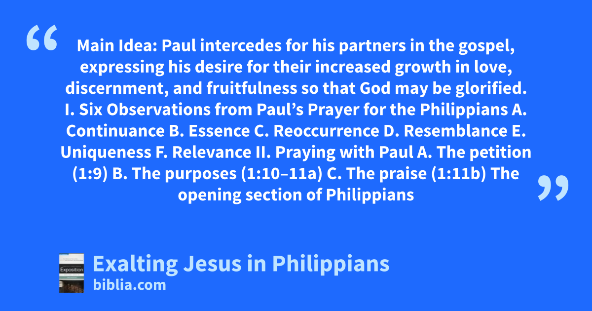 Main Idea: Paul intercedes for his partners in the gospel, expressing his desire for their increased growth in love, discernment, and fruitfulness so that God may be glorified. I. Six Observations from Paul’s Prayer for the Philippians A. Continuance B. Essence C. Reoccurrence D. Resemblance E. Uniqueness F. Relevance II. Praying with Paul A. The petition (1:9) B. The purposes (1:10–11a) C. The praise (1:11b) The opening section of Philippians