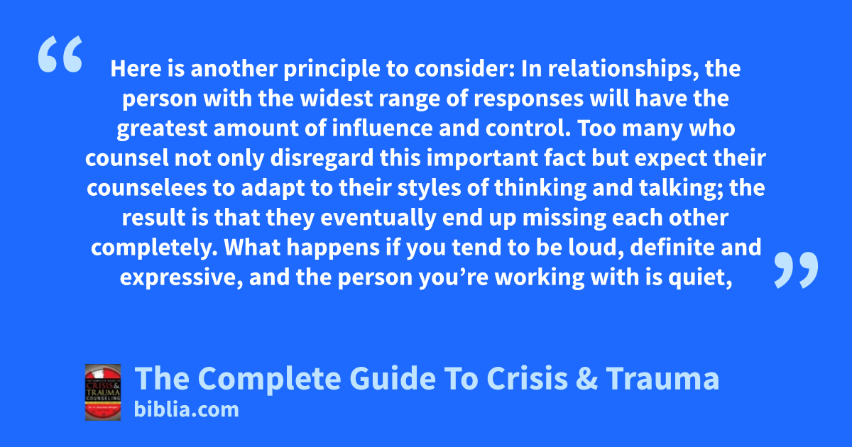 Here is another principle to consider: In relationships, the person with the widest range of responses will have the greatest amount of influence and control. Too many who counsel not only disregard this important fact but expect their counselees to adapt to their styles of thinking and talking; the result is that they eventually end up missing each other completely. What happens if you tend to be loud, definite and expressive, and the person you’re working with is quiet,