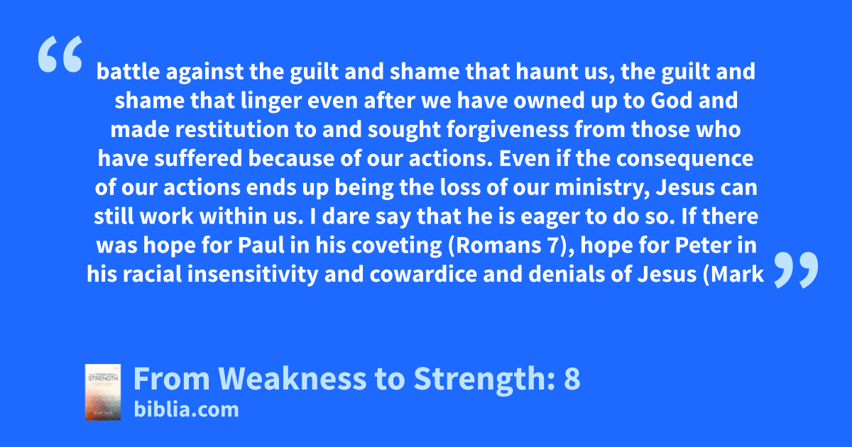 battle against the guilt and shame that haunt us, the guilt and shame that linger even after we have owned up to God and made restitution to and sought forgiveness from those who have suffered because of our actions. Even if the consequence of our actions ends up being the loss of our ministry, Jesus can still work within us. I dare say that he is eager to do so. If there was hope for Paul in his coveting (Romans 7), hope for Peter in his racial insensitivity and cowardice and denials of Jesus (Mark