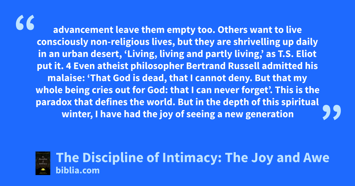 advancement leave them empty too. Others want to live consciously non-religious lives, but they are shrivelling up daily in an urban desert, ‘Living, living and partly living,’ as T.S. Eliot put it. 4 Even atheist philosopher Bertrand Russell admitted his malaise: ‘That God is dead, that I cannot deny. But that my whole being cries out for God: that I can never forget’. This is the paradox that defines the world. But in the depth of this spiritual winter, I have had the joy of seeing a new generation