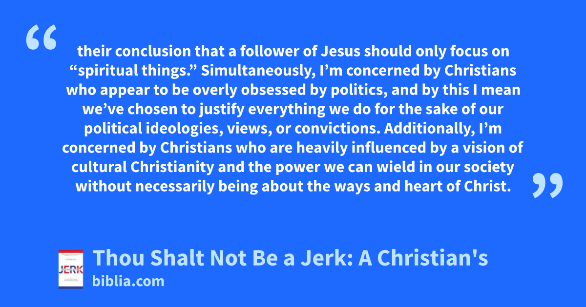 their conclusion that a follower of Jesus should only focus on “spiritual things.” Simultaneously, I’m concerned by Christians who appear to be overly obsessed by politics, and by this I mean we’ve chosen to justify everything we do for the sake of our political ideologies, views, or convictions. Additionally, I’m concerned by Christians who are heavily influenced by a vision of cultural Christianity and the power we can wield in our society without necessarily being about the ways and heart of Christ.
