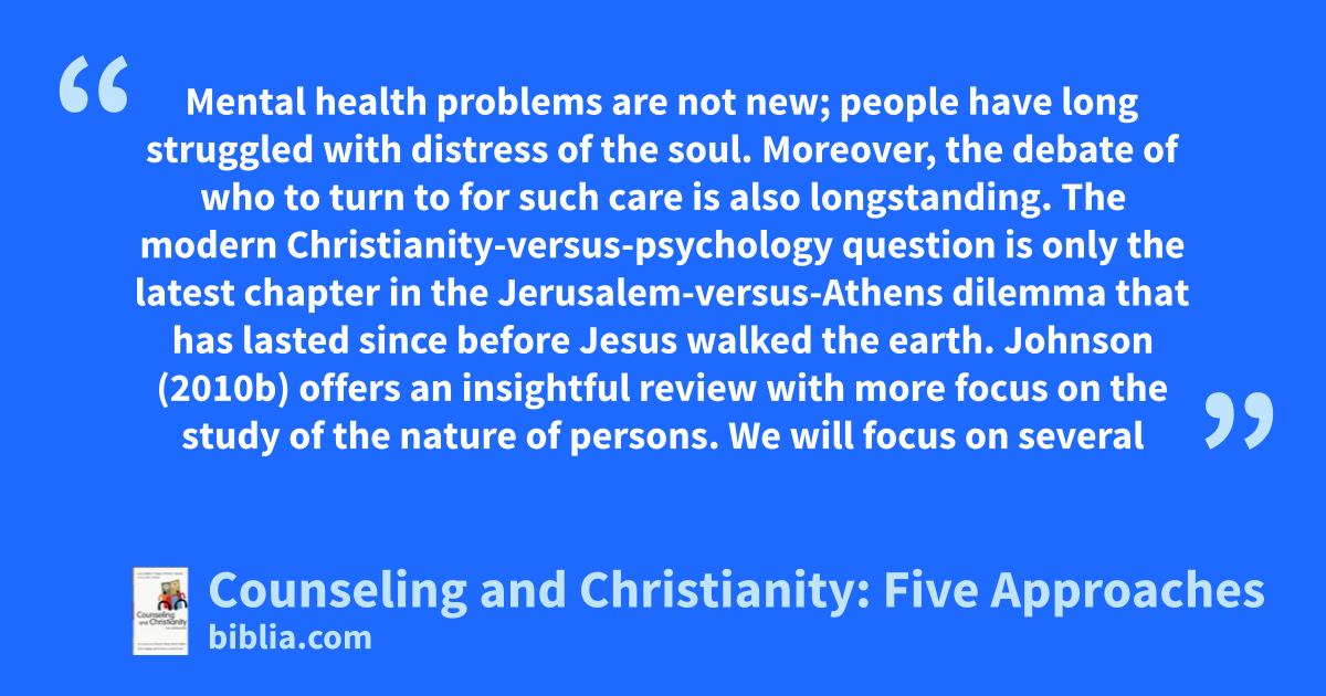 Mental health problems are not new; people have long struggled with distress of the soul. Moreover, the debate of who to turn to for such care is also longstanding. The modern Christianity-versus-psychology question is only the latest chapter in the Jerusalem-versus-Athens dilemma that has lasted since before Jesus walked the earth. Johnson (2010b) offers an insightful review with more focus on the study of the nature of persons. We will focus on several