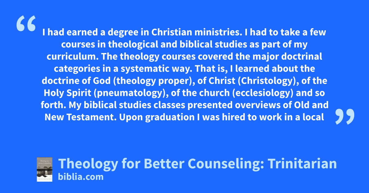 I had earned a degree in Christian ministries. I had to take a few courses in theological and biblical studies as part of my curriculum. The theology courses covered the major doctrinal categories in a systematic way. That is, I learned about the doctrine of God (theology proper), of Christ (Christology), of the Holy Spirit (pneumatology), of the church (ecclesiology) and so forth. My biblical studies classes presented overviews of Old and New Testament. Upon graduation I was hired to work in a local