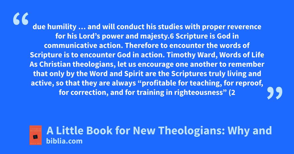 due humility … and will conduct his studies with proper reverence for his Lord’s power and majesty.6 Scripture is God in communicative action. Therefore to encounter the words of Scripture is to encounter God in action. Timothy Ward, Words of Life As Christian theologians, let us encourage one another to remember that only by the Word and Spirit are the Scriptures truly living and active, so that they are always “profitable for teaching, for reproof, for correction, and for training in righteousness” (2