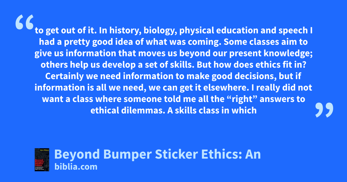to get out of it. In history, biology, physical education and speech I had a pretty good idea of what was coming. Some classes aim to give us information that moves us beyond our present knowledge; others help us develop a set of skills. But how does ethics fit in? Certainly we need information to make good decisions, but if information is all we need, we can get it elsewhere. I really did not want a class where someone told me all the “right” answers to ethical dilemmas. A skills class in which