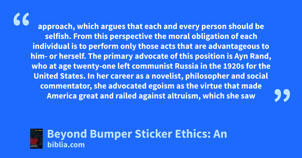 approach, which argues that each and every person should be selfish. From this perspective the moral obligation of each individual is to perform only those acts that are advantageous to him- or herself. The primary advocate of this position is Ayn Rand, who at age twenty-one left communist Russia in the 1920s for the United States. In her career as a novelist, philosopher and social commentator, she advocated egoism as the virtue that made America great and railed against altruism, which she saw