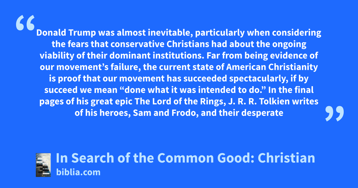 Donald Trump was almost inevitable, particularly when considering the fears that conservative Christians had about the ongoing viability of their dominant institutions. Far from being evidence of our movement’s failure, the current state of American Christianity is proof that our movement has succeeded spectacularly, if by succeed we mean “done what it was intended to do.” In the final pages of his great epic The Lord of the Rings, J. R. R. Tolkien writes of his heroes, Sam and Frodo, and their desperate