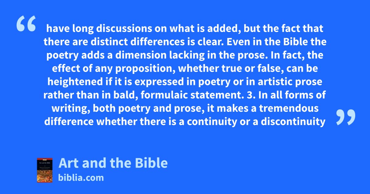 have long discussions on what is added, but the fact that there are distinct differences is clear. Even in the Bible the poetry adds a dimension lacking in the prose. In fact, the effect of any proposition, whether true or false, can be heightened if it is expressed in poetry or in artistic prose rather than in bald, formulaic statement. 3. In all forms of writing, both poetry and prose, it makes a tremendous difference whether there is a continuity or a discontinuity