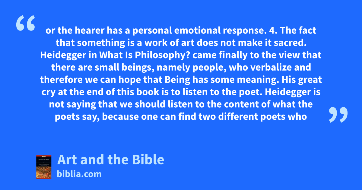 or the hearer has a personal emotional response. 4. The fact that something is a work of art does not make it sacred. Heidegger in What Is Philosophy? came finally to the view that there are small beings, namely people, who verbalize and therefore we can hope that Being has some meaning. His great cry at the end of this book is to listen to the poet. Heidegger is not saying that we should listen to the content of what the poets say, because one can find two different poets who