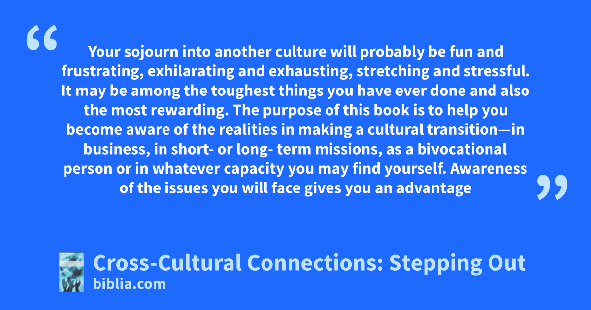 Your sojourn into another culture will probably be fun and frustrating, exhilarating and exhausting, stretching and stressful. It may be among the toughest things you have ever done and also the most rewarding. The purpose of this book is to help you become aware of the realities in making a cultural transition—in business, in short- or long- term missions, as a bivocational person or in whatever capacity you may find yourself. Awareness of the issues you will face gives you an advantage