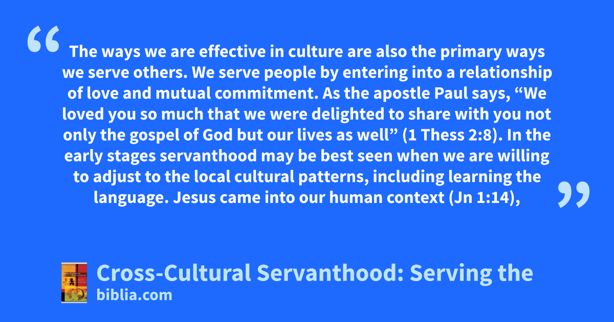 The ways we are effective in culture are also the primary ways we serve others. We serve people by entering into a relationship of love and mutual commitment. As the apostle Paul says, “We loved you so much that we were delighted to share with you not only the gospel of God but our lives as well” (1 Thess 2:8). In the early stages servanthood may be best seen when we are willing to adjust to the local cultural patterns, including learning the language. Jesus came into our human context (Jn 1:14),