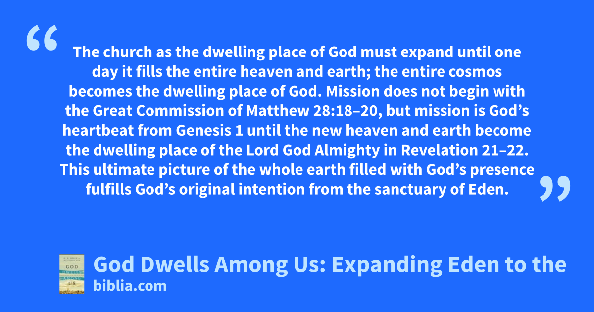 The church as the dwelling place of God must expand until one day it fills the entire heaven and earth; the entire cosmos becomes the dwelling place of God. Mission does not begin with the Great Commission of Matthew 28:18–20, but mission is God’s heartbeat from Genesis 1 until the new heaven and earth become the dwelling place of the Lord God Almighty in Revelation 21–22. This ultimate picture of the whole earth filled with God’s presence fulfills God’s original intention from the sanctuary of Eden.