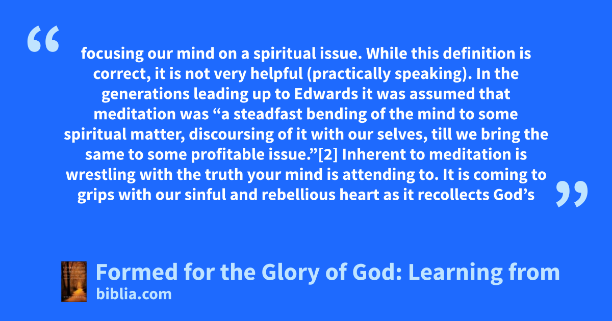 focusing our mind on a spiritual issue. While this definition is correct, it is not very helpful (practically speaking). In the generations leading up to Edwards it was assumed that meditation was “a steadfast bending of the mind to some spiritual matter, discoursing of it with our selves, till we bring the same to some profitable issue.”[2] Inherent to meditation is wrestling with the truth your mind is attending to. It is coming to grips with our sinful and rebellious heart as it recollects God’s