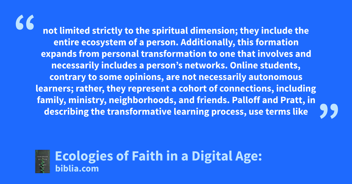 not limited strictly to the spiritual dimension; they include the entire ecosystem of a person. Additionally, this formation expands from personal transformation to one that involves and necessarily includes a person’s networks. Online students, contrary to some opinions, are not necessarily autonomous learners; rather, they represent a cohort of connections, including family, ministry, neighborhoods, and friends. Palloff and Pratt, in describing the transformative learning process, use terms like