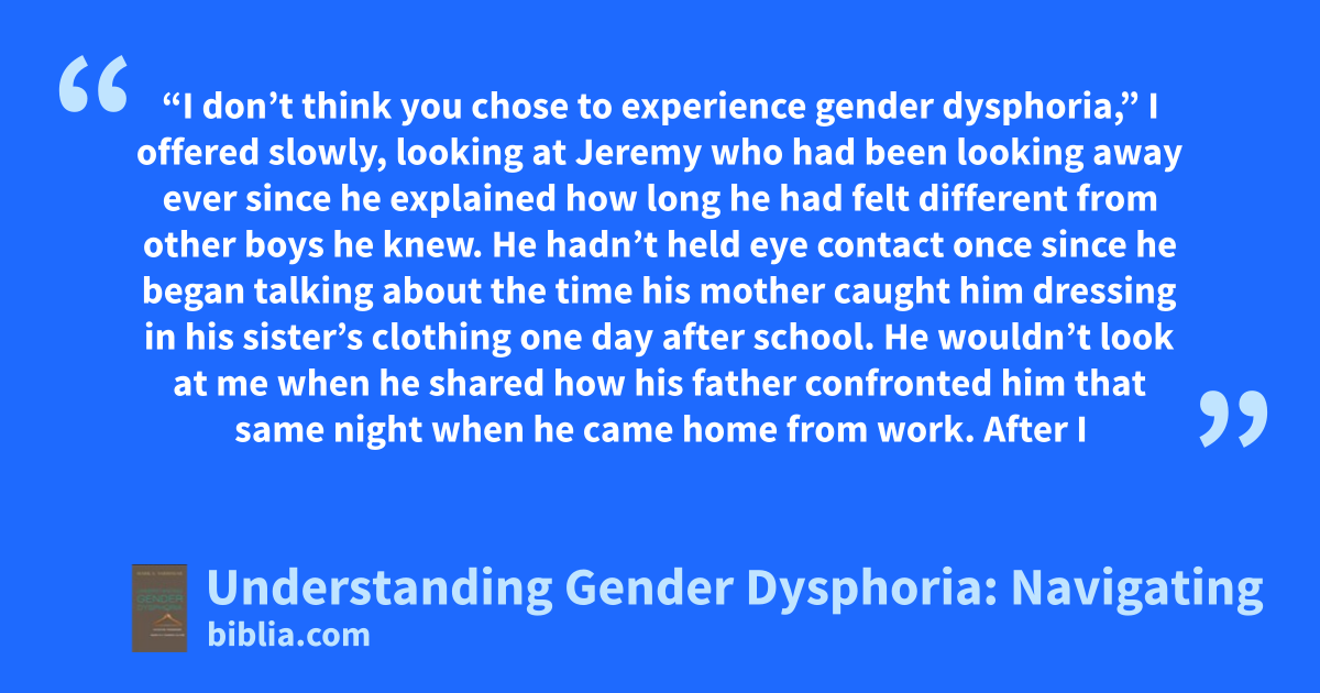 “I don’t think you chose to experience gender dysphoria,” I offered slowly, looking at Jeremy who had been looking away ever since he explained how long he had felt different from other boys he knew. He hadn’t held eye contact once since he began talking about the time his mother caught him dressing in his sister’s clothing one day after school. He wouldn’t look at me when he shared how his father confronted him that same night when he came home from work. After I