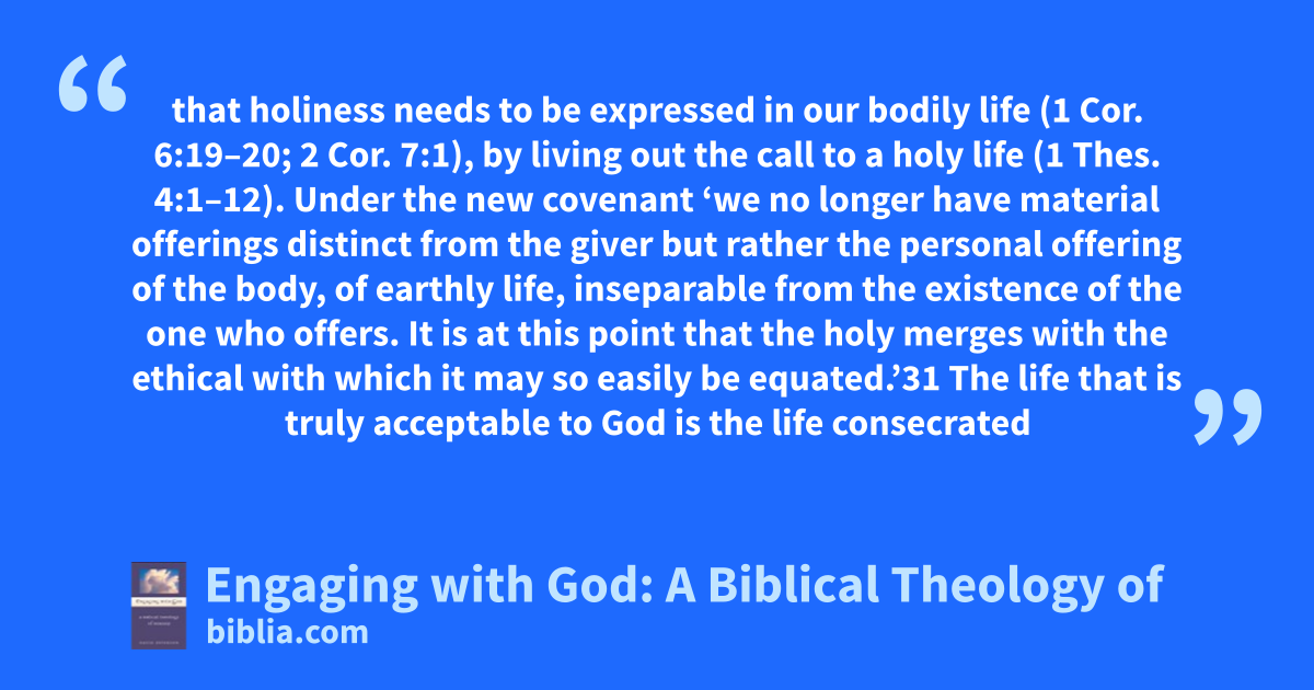 that holiness needs to be expressed in our bodily life (1 Cor. 6:19–20; 2 Cor. 7:1), by living out the call to a holy life (1 Thes. 4:1–12). Under the new covenant ‘we no longer have material offerings distinct from the giver but rather the personal offering of the body, of earthly life, inseparable from the existence of the one who offers. It is at this point that the holy merges with the ethical with which it may so easily be equated.’31 The life that is truly acceptable to God is the life consecrated