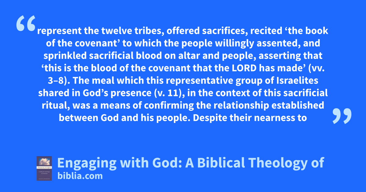 represent the twelve tribes, offered sacrifices, recited ‘the book of the covenant’ to which the people willingly assented, and sprinkled sacrificial blood on altar and people, asserting that ‘this is the blood of the covenant that the LORD has made’ (vv. 3–8). The meal which this representative group of Israelites shared in God’s presence (v. 11), in the context of this sacrificial ritual, was a means of confirming the relationship established between God and his people. Despite their nearness to