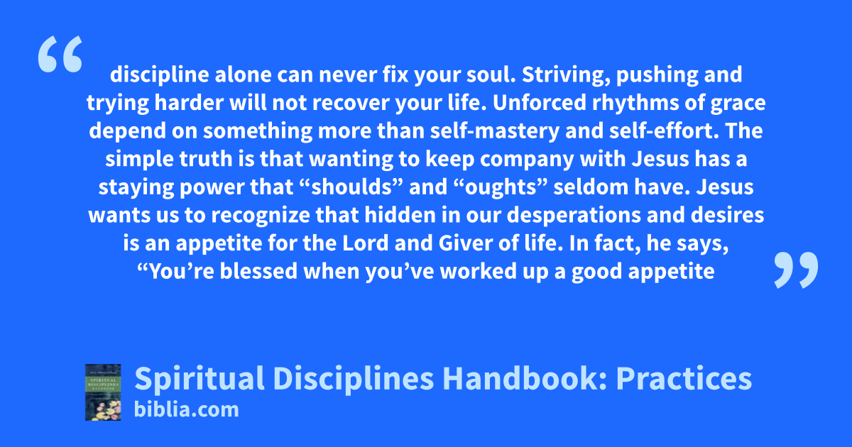 discipline alone can never fix your soul. Striving, pushing and trying harder will not recover your life. Unforced rhythms of grace depend on something more than self-mastery and self-effort. The simple truth is that wanting to keep company with Jesus has a staying power that “shoulds” and “oughts” seldom have. Jesus wants us to recognize that hidden in our desperations and desires is an appetite for the Lord and Giver of life. In fact, he says, “You’re blessed when you’ve worked up a good appetite