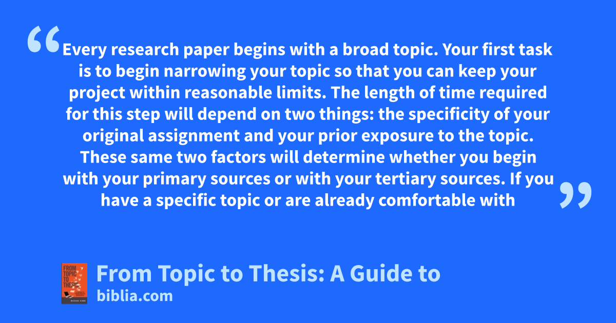 Every research paper begins with a broad topic. Your first task is to begin narrowing your topic so that you can keep your project within reasonable limits. The length of time required for this step will depend on two things: the specificity of your original assignment and your prior exposure to the topic. These same two factors will determine whether you begin with your primary sources or with your tertiary sources. If you have a specific topic or are already comfortable with