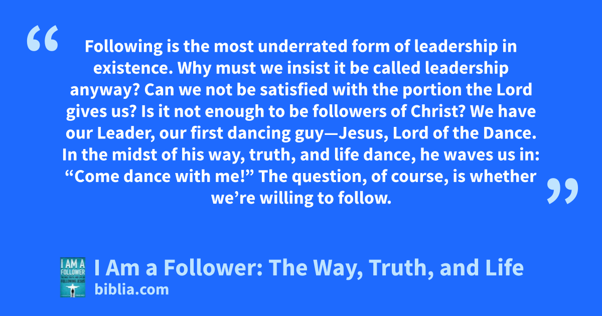 Following is the most underrated form of leadership in existence. Why must we insist it be called leadership anyway? Can we not be satisfied with the portion the Lord gives us? Is it not enough to be followers of Christ? We have our Leader, our first dancing guy—Jesus, Lord of the Dance. In the midst of his way, truth, and life dance, he waves us in: “Come dance with me!” The question, of course, is whether we’re willing to follow.