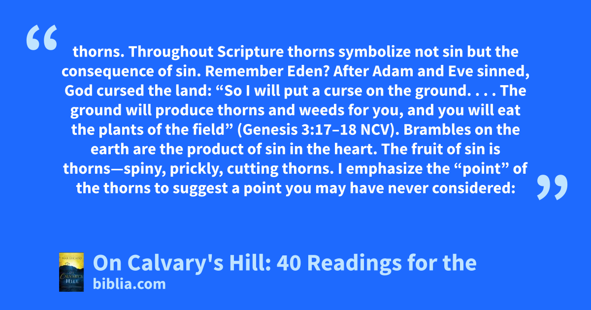 thorns. Throughout Scripture thorns symbolize not sin but the consequence of sin. Remember Eden? After Adam and Eve sinned, God cursed the land: “So I will put a curse on the ground. . . . The ground will produce thorns and weeds for you, and you will eat the plants of the field” (Genesis 3:17–18 NCV). Brambles on the earth are the product of sin in the heart. The fruit of sin is thorns—spiny, prickly, cutting thorns. I emphasize the “point” of the thorns to suggest a point you may have never considered: