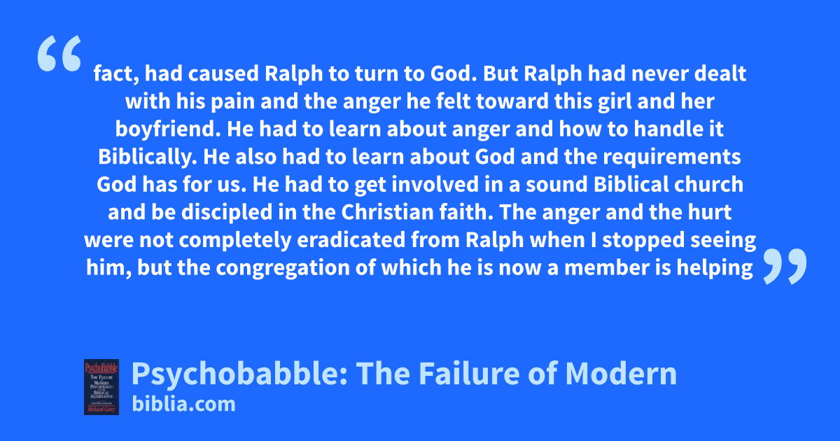 fact, had caused Ralph to turn to God. But Ralph had never dealt with his pain and the anger he felt toward this girl and her boyfriend. He had to learn about anger and how to handle it Biblically. He also had to learn about God and the requirements God has for us. He had to get involved in a sound Biblical church and be discipled in the Christian faith. The anger and the hurt were not completely eradicated from Ralph when I stopped seeing him, but the congregation of which he is now a member is helping