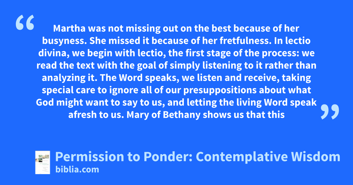 Martha was not missing out on the best because of her busyness. She missed it because of her fretfulness. In lectio divina, we begin with lectio, the first stage of the process: we read the text with the goal of simply listening to it rather than analyzing it. The Word speaks, we listen and receive, taking special care to ignore all of our presuppositions about what God might want to say to us, and letting the living Word speak afresh to us. Mary of Bethany shows us that this