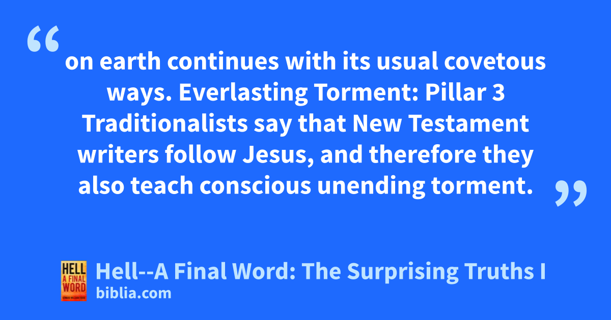 on earth continues with its usual covetous ways. Everlasting Torment: Pillar 3 Traditionalists say that New Testament writers follow Jesus, and therefore they also teach conscious unending torment.