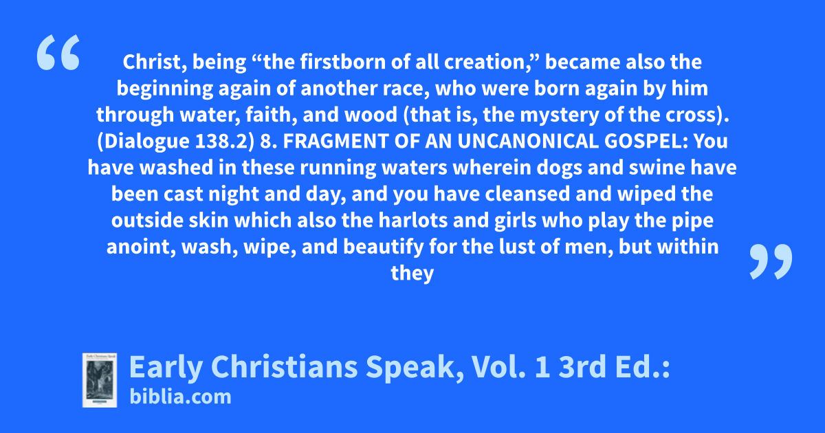 Christ, being “the firstborn of all creation,” became also the beginning again of another race, who were born again by him through water, faith, and wood (that is, the mystery of the cross). (Dialogue 138.2) 8. FRAGMENT OF AN UNCANONICAL GOSPEL: You have washed in these running waters wherein dogs and swine have been cast night and day, and you have cleansed and wiped the outside skin which also the harlots and girls who play the pipe anoint, wash, wipe, and beautify for the lust of men, but within they