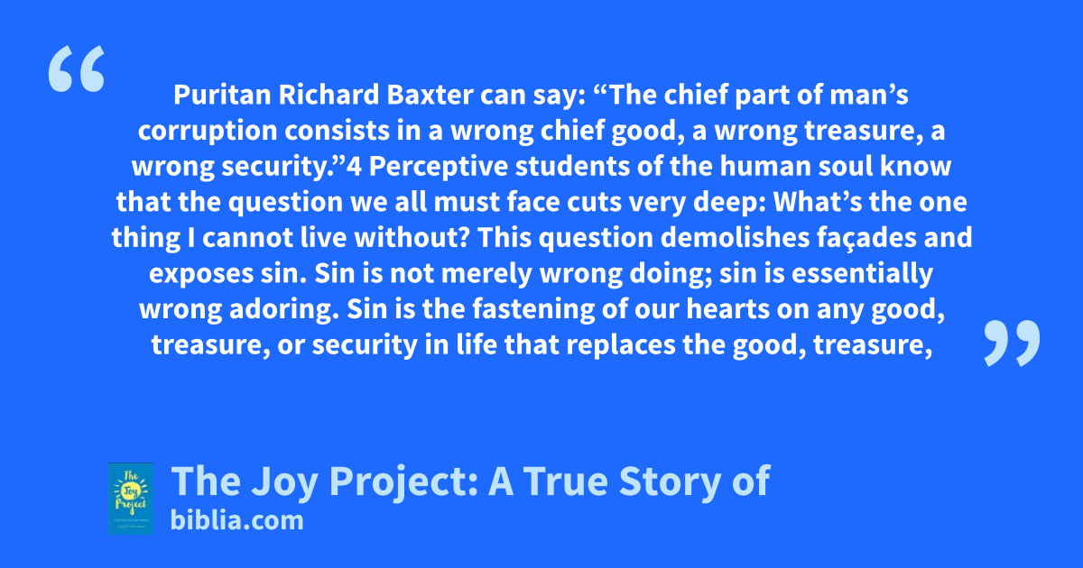 Puritan Richard Baxter can say: “The chief part of man’s corruption consists in a wrong chief good, a wrong treasure, a wrong security.”4 Perceptive students of the human soul know that the question we all must face cuts very deep: What’s the one thing I cannot live without? This question demolishes façades and exposes sin. Sin is not merely wrong doing; sin is essentially wrong adoring. Sin is the fastening of our hearts on any good, treasure, or security in life that replaces the good, treasure,