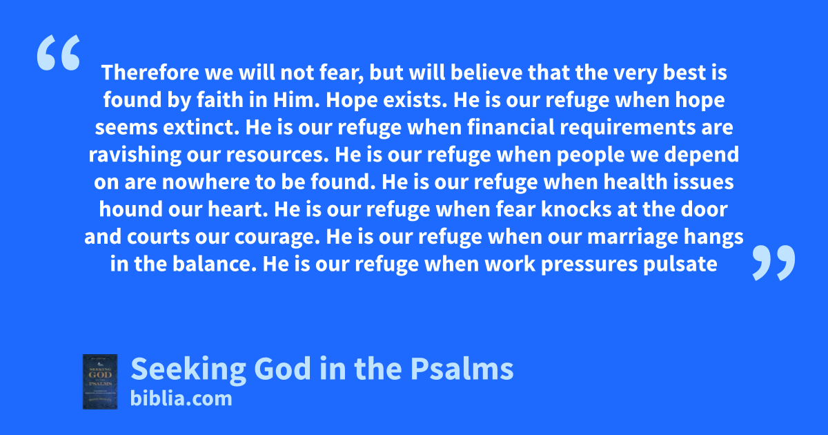 Therefore we will not fear, but will believe that the very best is found by faith in Him. Hope exists. He is our refuge when hope seems extinct. He is our refuge when financial requirements are ravishing our resources. He is our refuge when people we depend on are nowhere to be found. He is our refuge when health issues hound our heart. He is our refuge when fear knocks at the door and courts our courage. He is our refuge when our marriage hangs in the balance. He is our refuge when work pressures pulsate