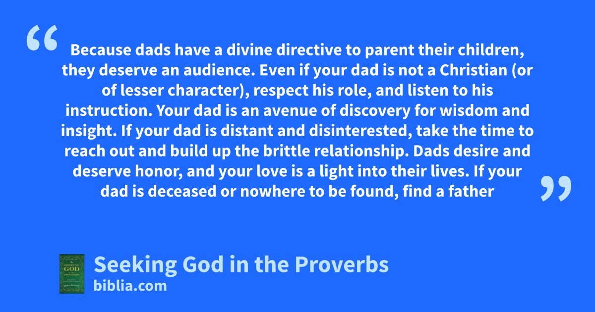 Because dads have a divine directive to parent their children, they deserve an audience. Even if your dad is not a Christian (or of lesser character), respect his role, and listen to his instruction. Your dad is an avenue of discovery for wisdom and insight. If your dad is distant and disinterested, take the time to reach out and build up the brittle relationship. Dads desire and deserve honor, and your love is a light into their lives. If your dad is deceased or nowhere to be found, find a father
