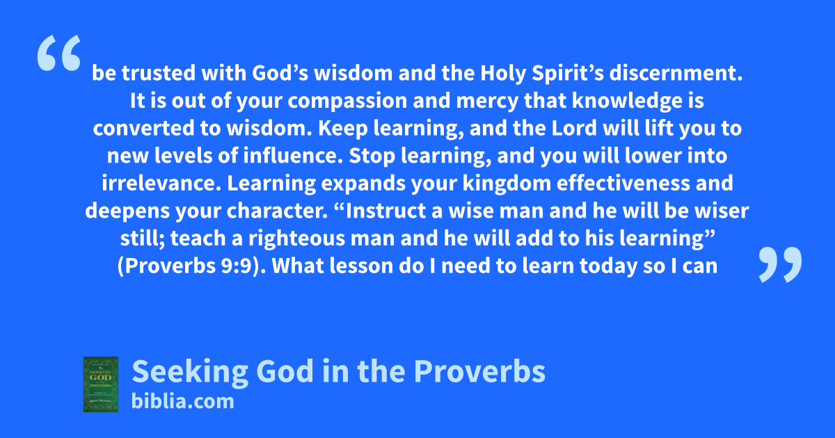 be trusted with God’s wisdom and the Holy Spirit’s discernment. It is out of your compassion and mercy that knowledge is converted to wisdom. Keep learning, and the Lord will lift you to new levels of influence. Stop learning, and you will lower into irrelevance. Learning expands your kingdom effectiveness and deepens your character. “Instruct a wise man and he will be wiser still; teach a righteous man and he will add to his learning” (Proverbs 9:9). What lesson do I need to learn today so I can