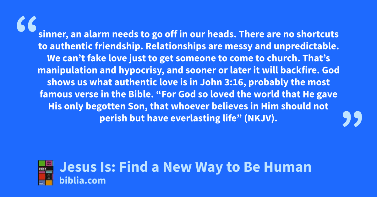 sinner, an alarm needs to go off in our heads. There are no shortcuts to authentic friendship. Relationships are messy and unpredictable. We can’t fake love just to get someone to come to church. That’s manipulation and hypocrisy, and sooner or later it will backfire. God shows us what authentic love is in John 3:16, probably the most famous verse in the Bible. “For God so loved the world that He gave His only begotten Son, that whoever believes in Him should not perish but have everlasting life” (NKJV).