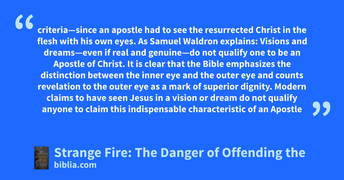 criteria—since an apostle had to see the resurrected Christ in the flesh with his own eyes. As Samuel Waldron explains: Visions and dreams—even if real and genuine—do not qualify one to be an Apostle of Christ. It is clear that the Bible emphasizes the distinction between the inner eye and the outer eye and counts revelation to the outer eye as a mark of superior dignity. Modern claims to have seen Jesus in a vision or dream do not qualify anyone to claim this indispensable characteristic of an Apostle