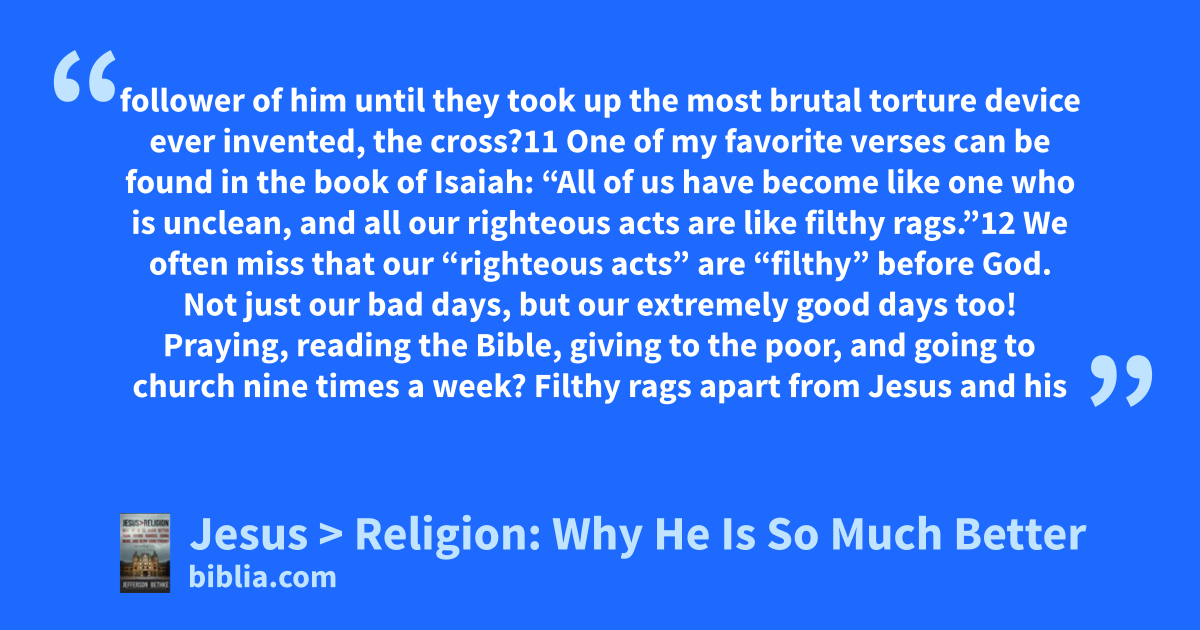 follower of him until they took up the most brutal torture device ever invented, the cross?11 One of my favorite verses can be found in the book of Isaiah: “All of us have become like one who is unclean, and all our righteous acts are like filthy rags.”12 We often miss that our “righteous acts” are “filthy” before God. Not just our bad days, but our extremely good days too! Praying, reading the Bible, giving to the poor, and going to church nine times a week? Filthy rags apart from Jesus and his