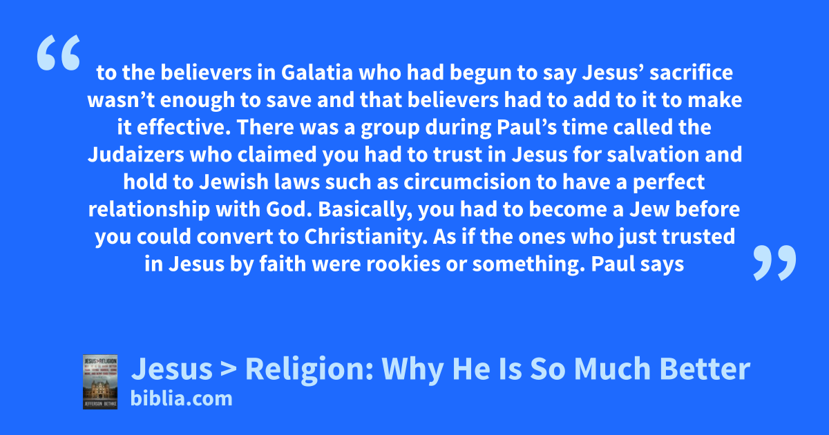 to the believers in Galatia who had begun to say Jesus’ sacrifice wasn’t enough to save and that believers had to add to it to make it effective. There was a group during Paul’s time called the Judaizers who claimed you had to trust in Jesus for salvation and hold to Jewish laws such as circumcision to have a perfect relationship with God. Basically, you had to become a Jew before you could convert to Christianity. As if the ones who just trusted in Jesus by faith were rookies or something. Paul says