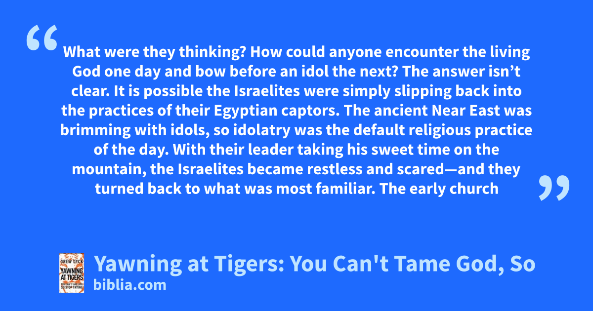 What were they thinking? How could anyone encounter the living God one day and bow before an idol the next? The answer isn’t clear. It is possible the Israelites were simply slipping back into the practices of their Egyptian captors. The ancient Near East was brimming with idols, so idolatry was the default religious practice of the day. With their leader taking his sweet time on the mountain, the Israelites became restless and scared—and they turned back to what was most familiar. The early church
