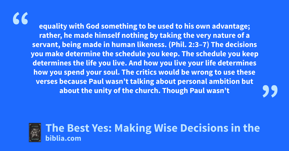 equality with God something to be used to his own advantage; rather, he made himself nothing by taking the very nature of a servant, being made in human likeness. (Phil. 2:3–7) The decisions you make determine the schedule you keep. The schedule you keep determines the life you live. And how you live your life determines how you spend your soul. The critics would be wrong to use these verses because Paul wasn’t talking about personal ambition but about the unity of the church. Though Paul wasn’t
