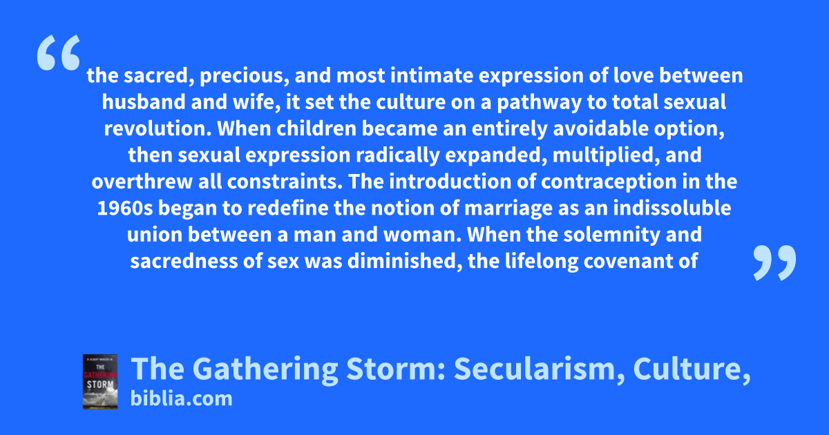 the sacred, precious, and most intimate expression of love between husband and wife, it set the culture on a pathway to total sexual revolution. When children became an entirely avoidable option, then sexual expression radically expanded, multiplied, and overthrew all constraints. The introduction of contraception in the 1960s began to redefine the notion of marriage as an indissoluble union between a man and woman. When the solemnity and sacredness of sex was diminished, the lifelong covenant of