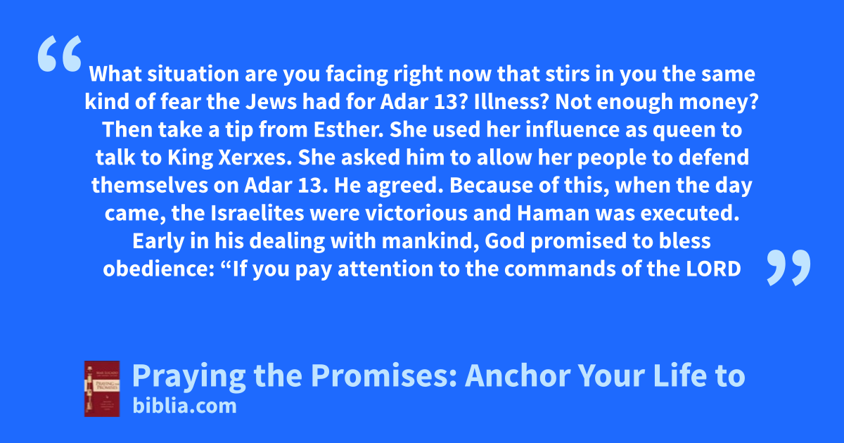 What situation are you facing right now that stirs in you the same kind of fear the Jews had for Adar 13? Illness? Not enough money? Then take a tip from Esther. She used her influence as queen to talk to King Xerxes. She asked him to allow her people to defend themselves on Adar 13. He agreed. Because of this, when the day came, the Israelites were victorious and Haman was executed. Early in his dealing with mankind, God promised to bless obedience: “If you pay attention to the commands of the LORD
