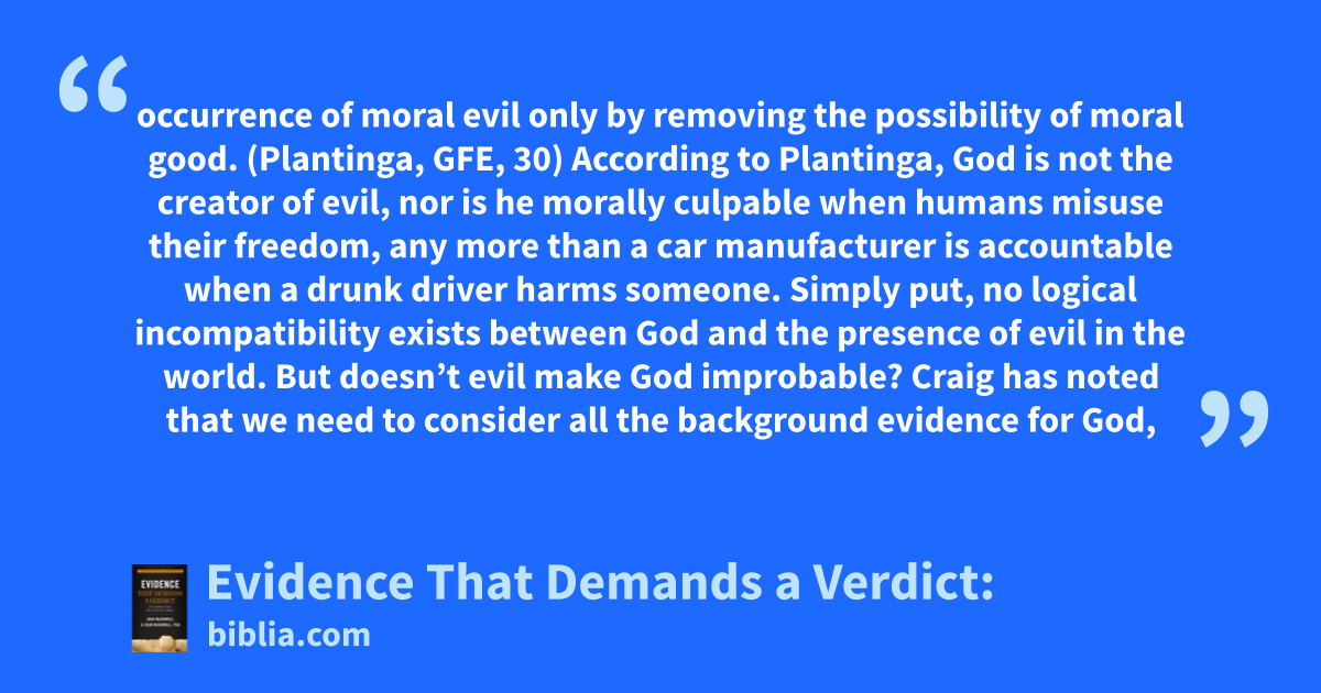 occurrence of moral evil only by removing the possibility of moral good. (Plantinga, GFE, 30) According to Plantinga, God is not the creator of evil, nor is he morally culpable when humans misuse their freedom, any more than a car manufacturer is accountable when a drunk driver harms someone. Simply put, no logical incompatibility exists between God and the presence of evil in the world. But doesn’t evil make God improbable? Craig has noted that we need to consider all the background evidence for God,