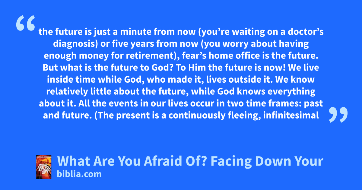 the future is just a minute from now (you’re waiting on a doctor’s diagnosis) or five years from now (you worry about having enough money for retirement), fear’s home office is the future. But what is the future to God? To Him the future is now! We live inside time while God, who made it, lives outside it. We know relatively little about the future, while God knows everything about it. All the events in our lives occur in two time frames: past and future. (The present is a continuously fleeing, infinitesimal