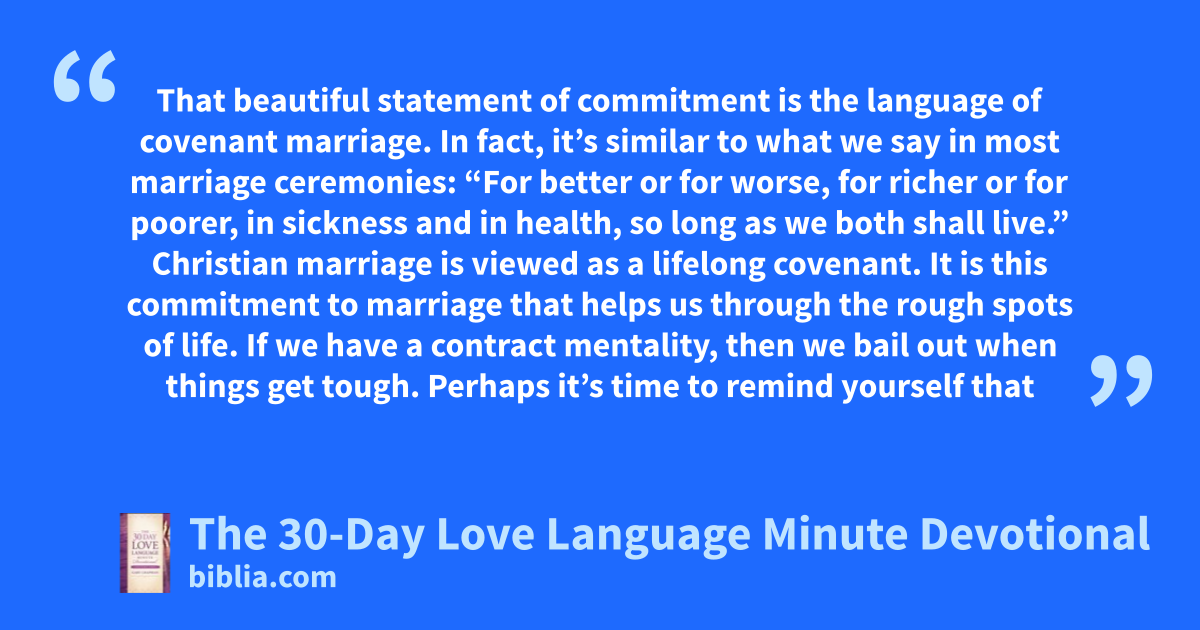 That beautiful statement of commitment is the language of covenant marriage. In fact, it’s similar to what we say in most marriage ceremonies: “For better or for worse, for richer or for poorer, in sickness and in health, so long as we both shall live.” Christian marriage is viewed as a lifelong covenant. It is this commitment to marriage that helps us through the rough spots of life. If we have a contract mentality, then we bail out when things get tough. Perhaps it’s time to remind yourself that