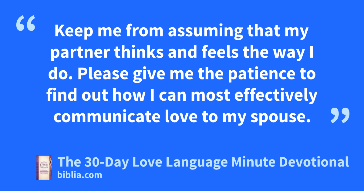 Keep me from assuming that my partner thinks and feels the way I do. Please give me the patience to find out how I can most effectively communicate love to my spouse.