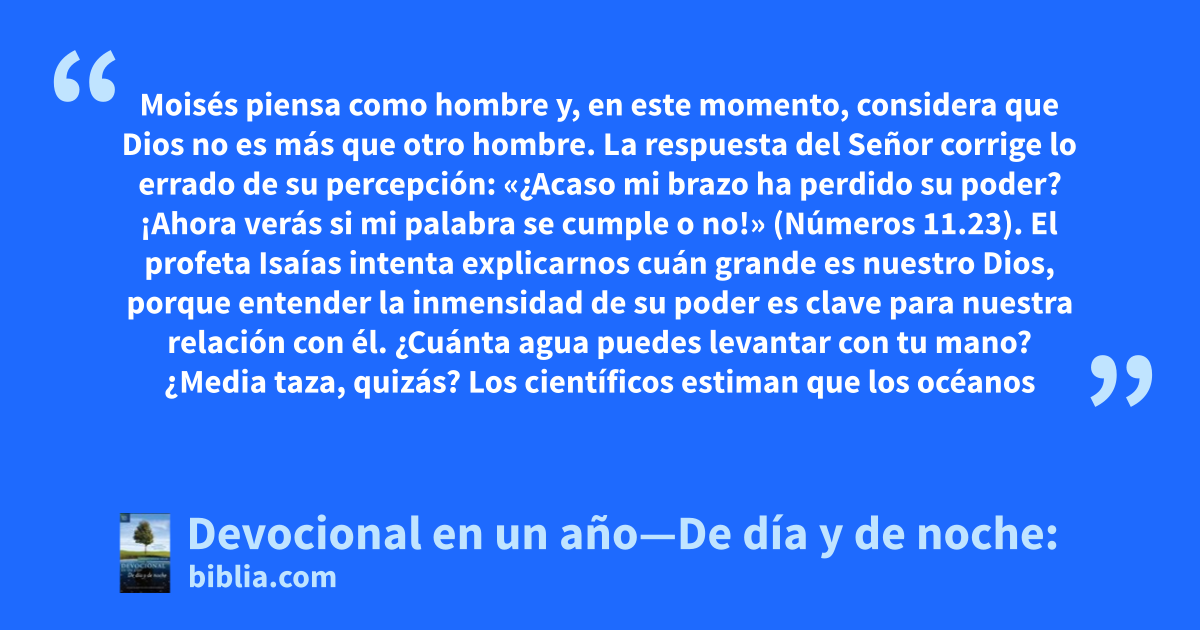 Moisés piensa como hombre y, en este momento, considera que Dios no es más que otro hombre. La respuesta del Señor corrige lo errado de su percepción: «¿Acaso mi brazo ha perdido su poder? ¡Ahora verás si mi palabra se cumple o no!» (Números 11.23). El profeta Isaías intenta explicarnos cuán grande es nuestro Dios, porque entender la inmensidad de su poder es clave para nuestra relación con él. ¿Cuánta agua puedes levantar con tu mano? ¿Media taza, quizás? Los científicos estiman que los océanos