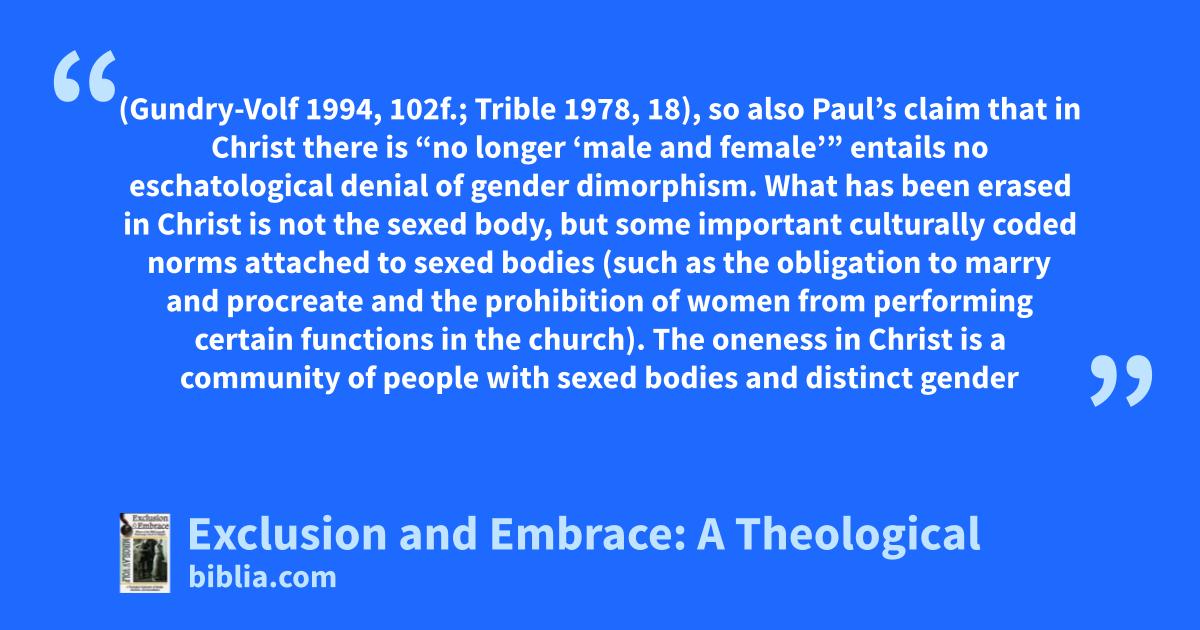 (Gundry-Volf 1994, 102f.; Trible 1978, 18), so also Paul’s claim that in Christ there is “no longer ‘male and female’” entails no eschatological denial of gender dimorphism. What has been erased in Christ is not the sexed body, but some important culturally coded norms attached to sexed bodies (such as the obligation to marry and procreate and the prohibition of women from performing certain functions in the church). The oneness in Christ is a community of people with sexed bodies and distinct gender