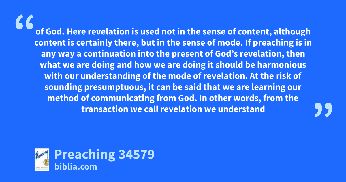 of God. Here revelation is used not in the sense of content, although content is certainly there, but in the sense of mode. If preaching is in any way a continuation into the present of God’s revelation, then what we are doing and how we are doing it should be harmonious with our understanding of the mode of revelation. At the risk of sounding presumptuous, it can be said that we are learning our method of communicating from God. In other words, from the transaction we call revelation we understand