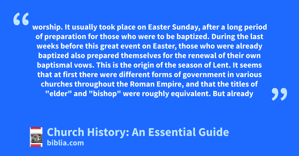 worship. It usually took place on Easter Sunday, after a long period of preparation for those who were to be baptized. During the last weeks before this great event on Easter, those who were already baptized also prepared themselves for the renewal of their own baptismal vows. This is the origin of the season of Lent. It seems that at first there were different forms of government in various churches throughout the Roman Empire, and that the titles of "elder" and "bishop" were roughly equivalent. But already