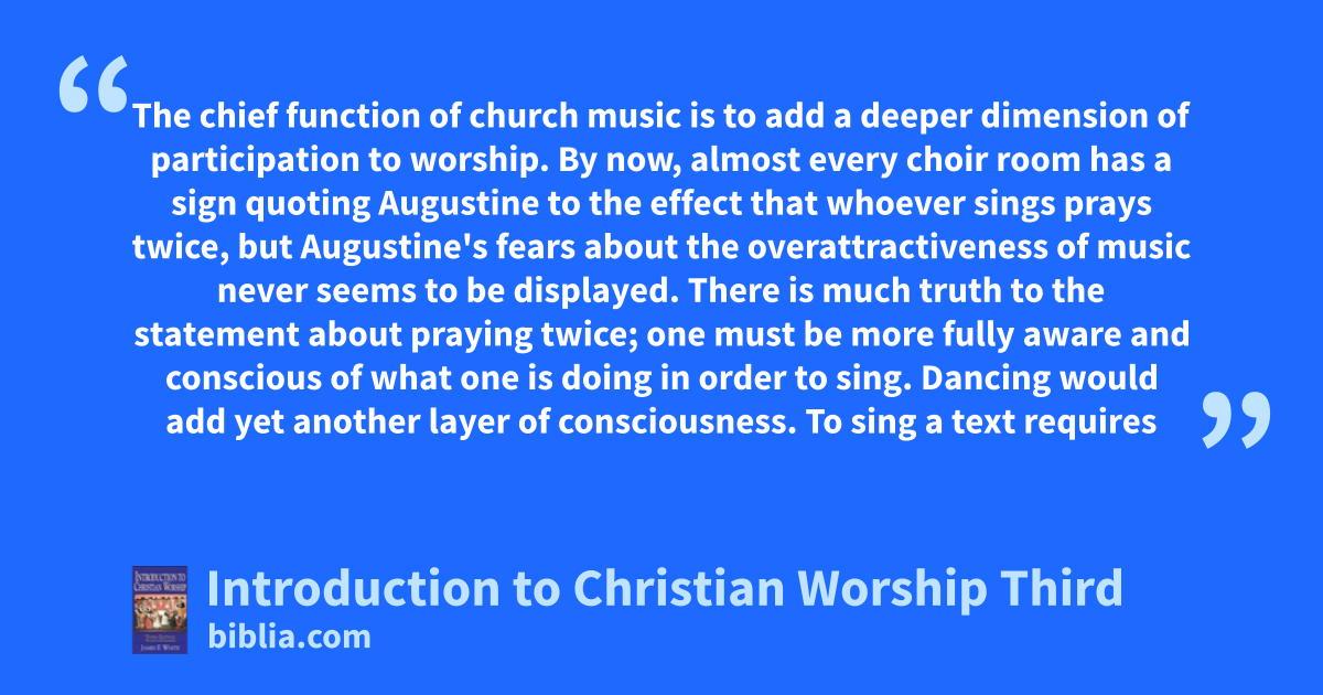 The chief function of church music is to add a deeper dimension of participation to worship. By now, almost every choir room has a sign quoting Augustine to the effect that whoever sings prays twice, but Augustine's fears about the overattractiveness of music never seems to be displayed. There is much truth to the statement about praying twice; one must be more fully aware and conscious of what one is doing in order to sing. Dancing would add yet another layer of consciousness. To sing a text requires